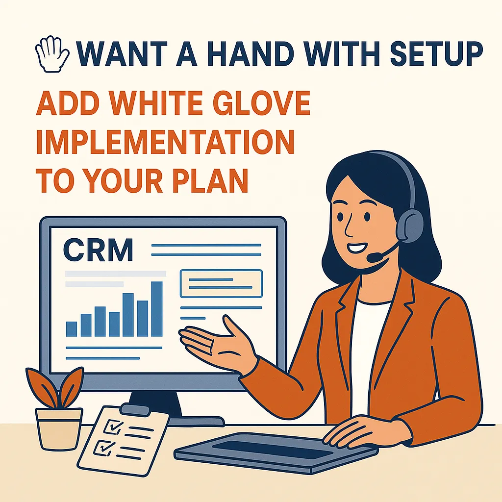 While setup isn’t required, many of our clients choose to get up and running faster with our White Glove Implementation—an optional, paid service where we configure your CRM for you.